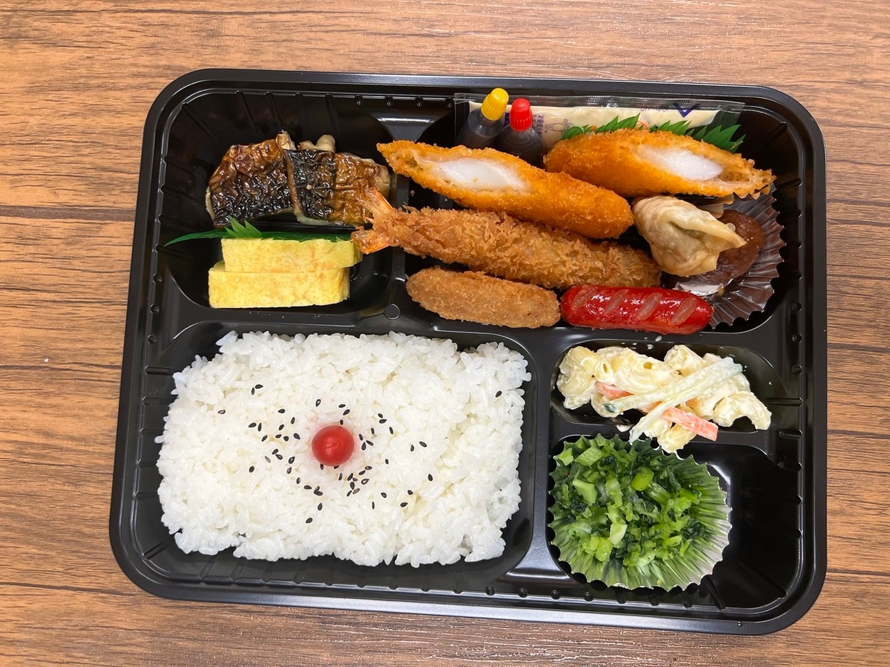 えびフライ、いかフライ、ミニミンチカツ、ミートボール、揚げ餃子、ウインナー、卵焼き、アジの塩焼、野沢菜、マカロニサラダと豪華なおかずが満載です。